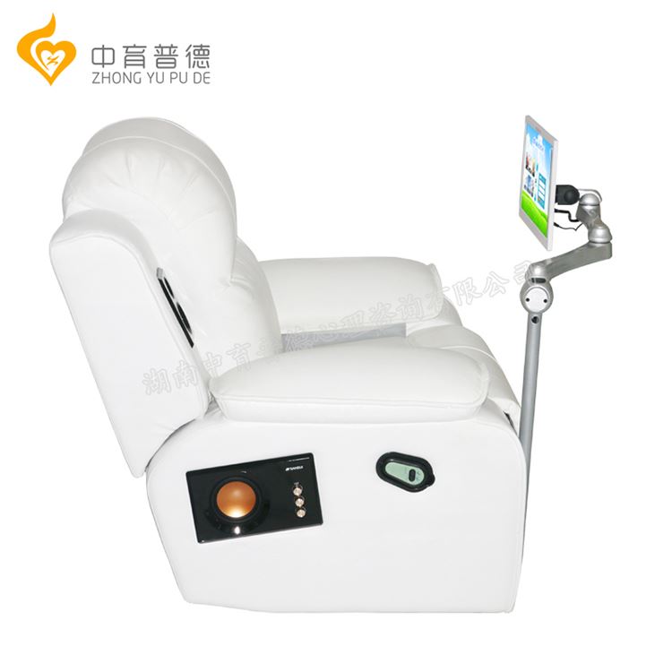 音乐放松椅根据人体工学原理制作,贴合人体的流线型设计,电动调节功能,全角度旋转,自带调位锁定,方便自由选择坐、躺、卧等自然、放松的姿势。通过智能反馈音乐放松软件系统分析生理信号、智能选择放松方案、反馈生理指标、生成放松训练报告、储存放松数据,满足不同放松需求,缓解压力、改善、提高信心。从而使生理和心理得到足够的休息,享受轻松愉快的治疗。