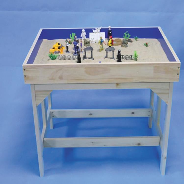 1、天蓝色的沙盘容器:治疗室必备的是两个规定大小的装沙的矩形盘。一个用于做干沙盘,另一个可以放水,做湿沙盘。其底面是蓝色的,这蓝色可以象征海洋和天空。在游戏过程中,可以通过拨开沙子露出蓝色的底面来表示湖泊或河流等。沙盘本身具有心理容器的象征意义,来访者的所有问题都可能在这样的空间中得到包容或化解;